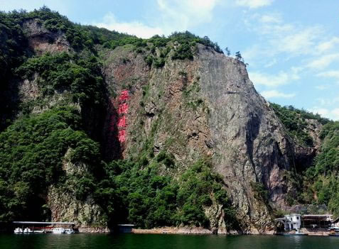 由紫藤長廊拾階登上壩頂,眼前展現(xiàn)的是一湖靜水,綠水蕩漾,深不可測。 水面上疾駛的游船,不時激起層層漣漪,把兩岸的元寶峰,鷲鷹峰,仙桃峰、杜鵑峰、老僧峰、仙掌峰等山峰的倒影彎折。 泛舟湖上,水鳥在水面低飛,狹長的湖面見不到盡頭,大有“青山綠水景無盡”之感,又有“一折青山一扇屏,一彎綠水一古琴”的詩意。沿湖兩邊,蔥蘢俊秀,美不勝收。春天萬木崢嶸,紅杜鵑從綠樹叢中透出;夏天滿山蔥郁,濃蔭蔽日;一到秋冬季節(jié),蒼黃的銀杏葉和紅艷的楓葉,點綴在一片蕭瑟之中。