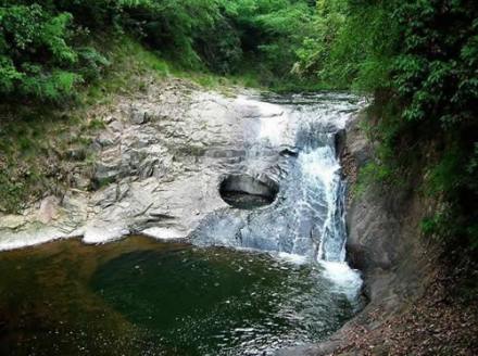 瀑布下面的深潭大約5米,黝黑無底,俗呼“大腳桶潭”。