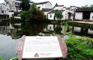 鐘池位于諸葛村的中心,在大公堂正前面,面積0.24公頃,它的邊上是一塊與它逆對稱面積的陸地,村民用以曬場之用。易經(jīng)上說“東南為陽、西北為陰”再加上“天圓地方”之說,空地和鐘池正呈陰陽太極圖形。陸地靠北和鐘池靠南各有一顆水井,正是太極中的魚眼。鐘池的南岸是一個陡坡,順著陡坡而建的幾幢大房子從北岸望去一幢比一幢高,加上前面貼水一溜小平房,跌宕起伏,輪廓線大起大落,景象峭拔而優(yōu)美。